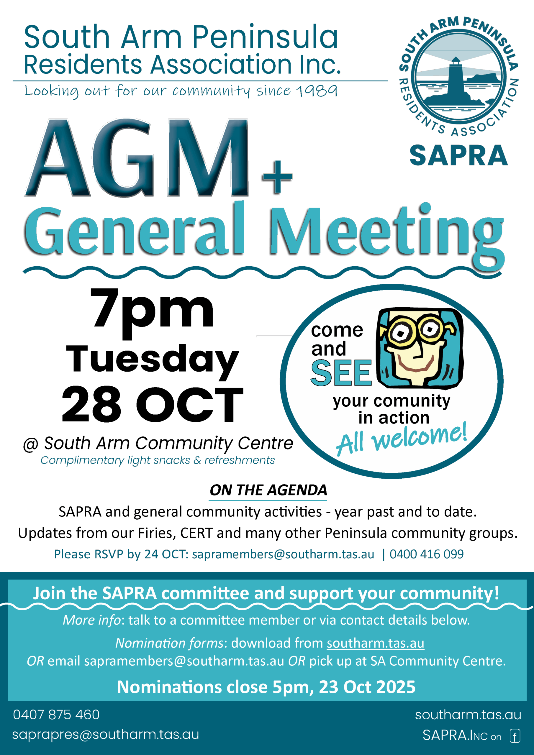 You can download the SAPRA committee nomination 2025-2026 form here >, pick one up from the Community Centre or request one via email SAPRAmembers@southarm.tas.au Nominations close Thursday 23th October.